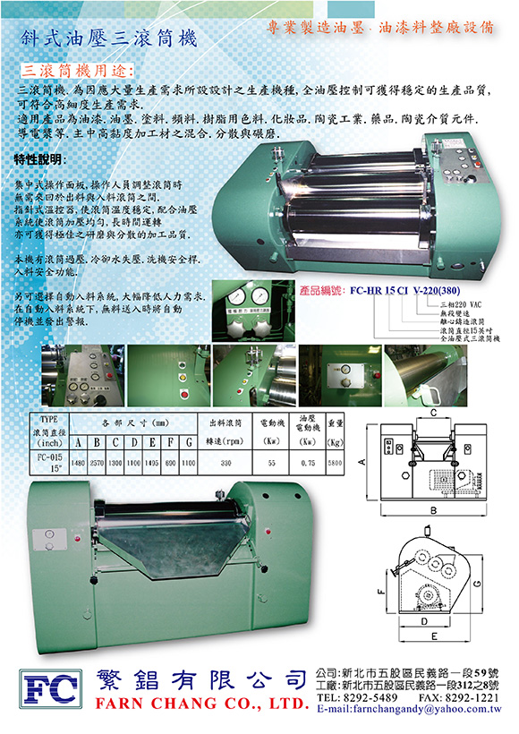 •本公司產品多種型式從研發式少量生產專用FC-65mm、FC-90 mm桌上型三滾筒機及一般現場大量生產型6英吋到16英吋專業製造,符合高品質高標準。